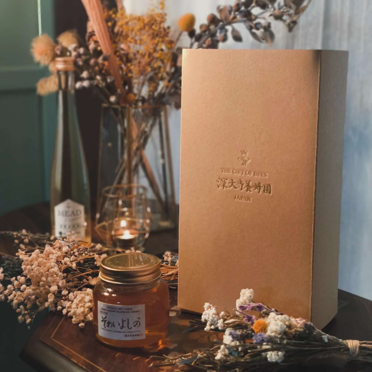 化粧箱には深大寺養蜂園の箔押しが入り、高級感漂うデザインに仕上げました。大切な人へのプレゼントとしていかがですか。