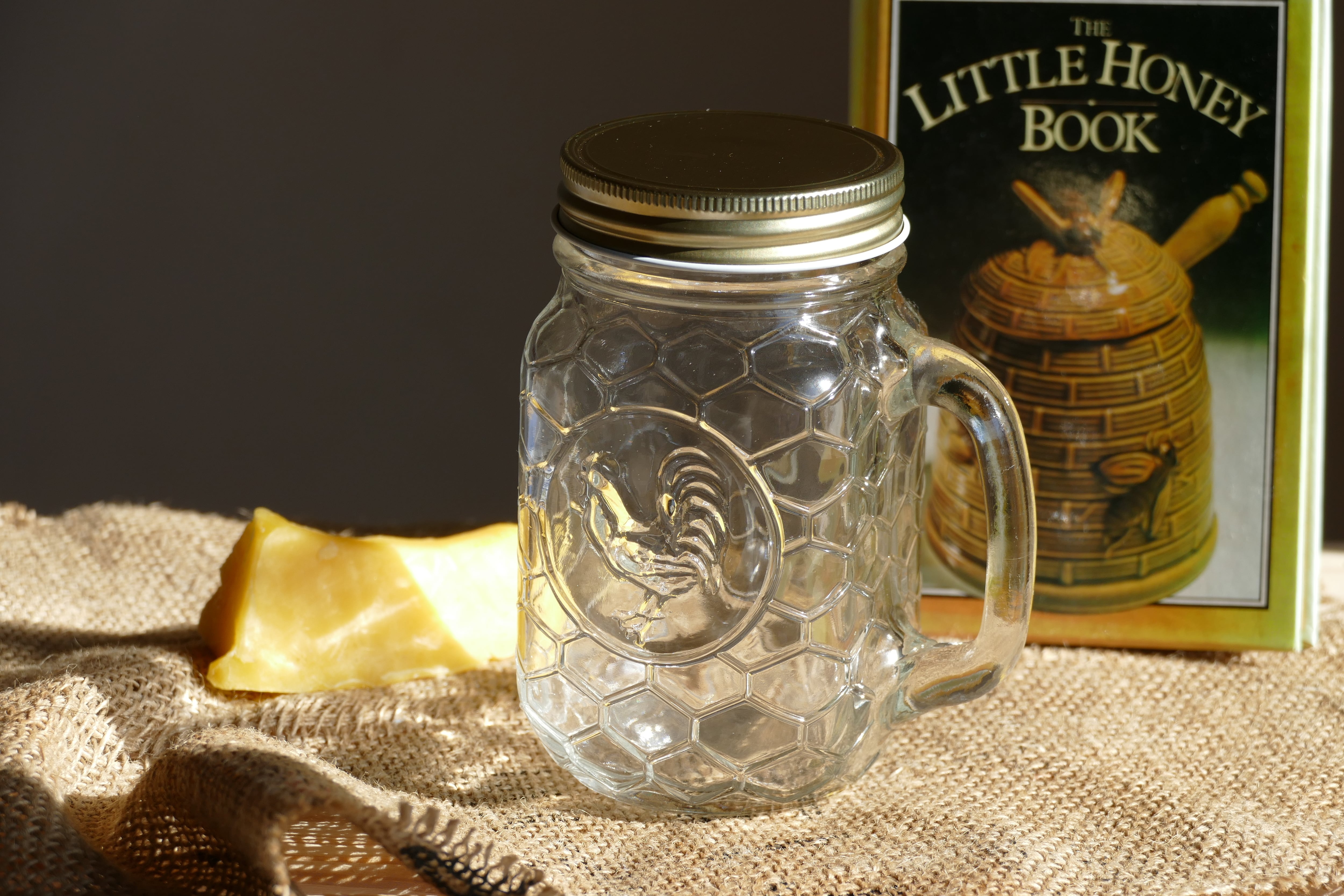 ミツバチ好きにはたまらない6角形柄!フタ付&ハンドル付きのジャーです。