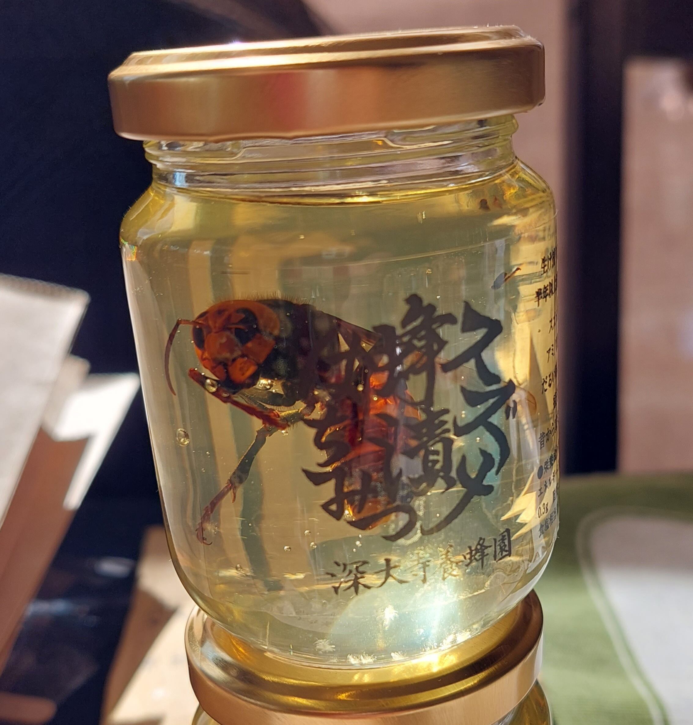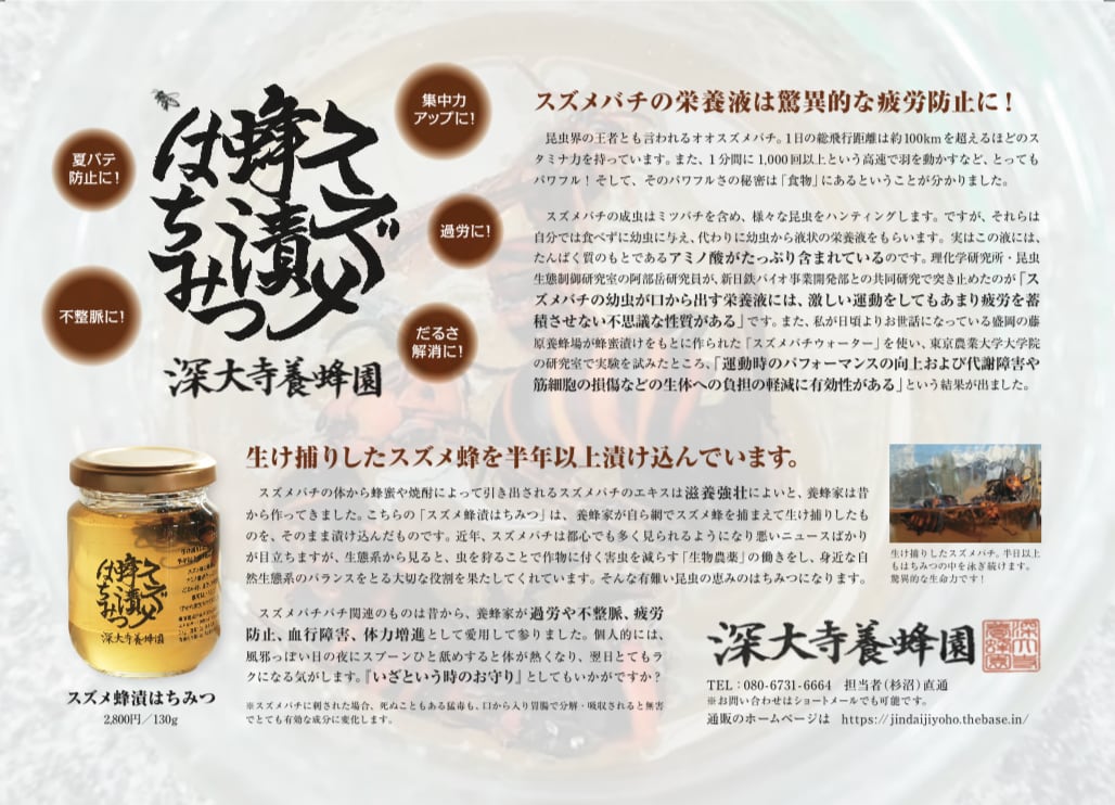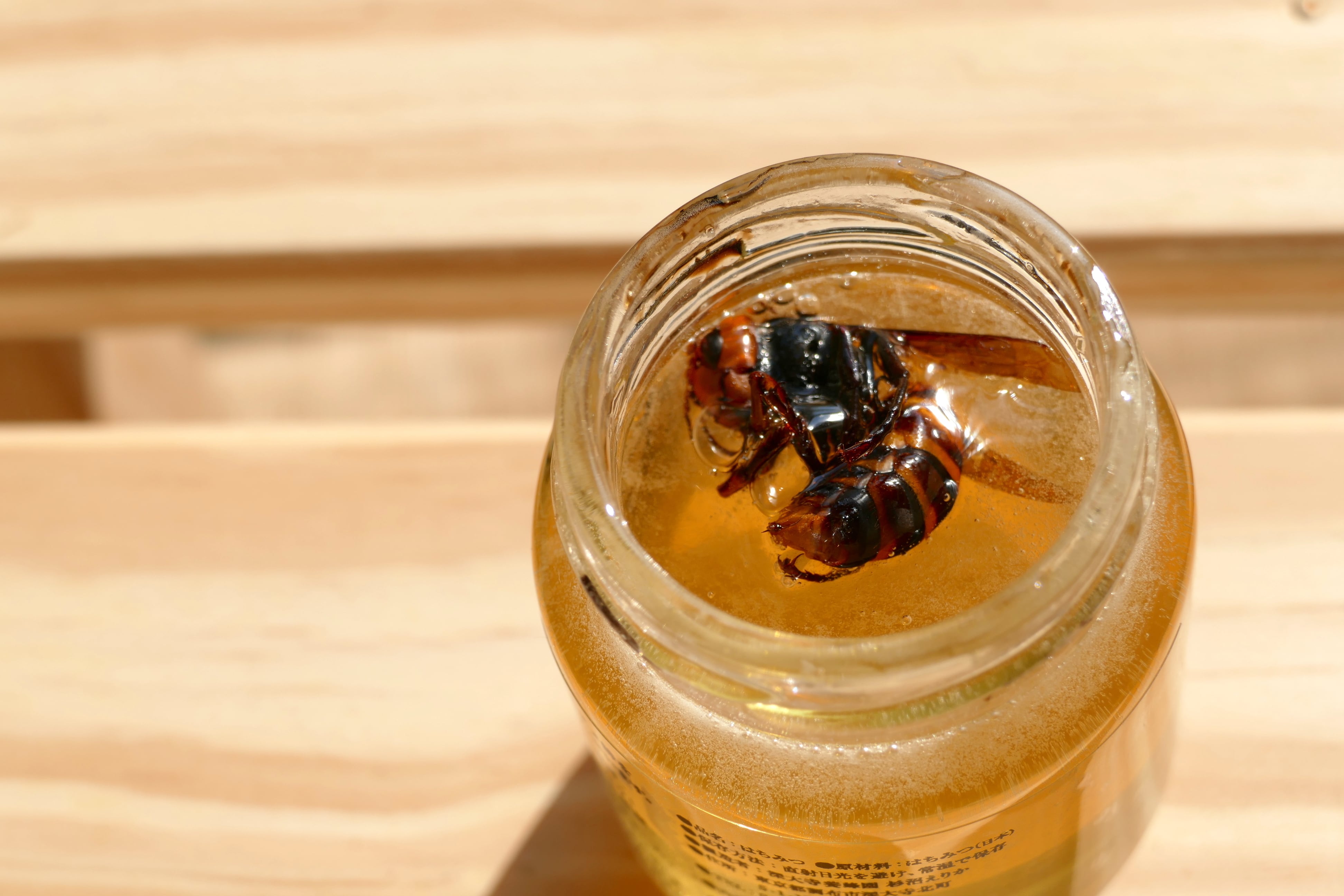 スズメバチの体から蜂蜜や焼酎によって引き出されるスズメバチのエキスは滋養強壮によいと、養蜂家は昔から作ってきました。こちらの「スズメ蜂漬はちみつ」は、私が自ら網でスズメ蜂を捕まえて生け捕りしたものを、そのまま漬け込んだものです。近年、スズメバチは都心でも多く見られるようになり悪いニュースばかりが目立ちますが、生態系から見ると、虫を狩ることで作物に付く害虫を減らす「生物農薬」の働きをし、身近な自然生態系のバランスをとる大切な役割を果たしてくれています。そんな有難い昆虫の恵みのはちみつになります。