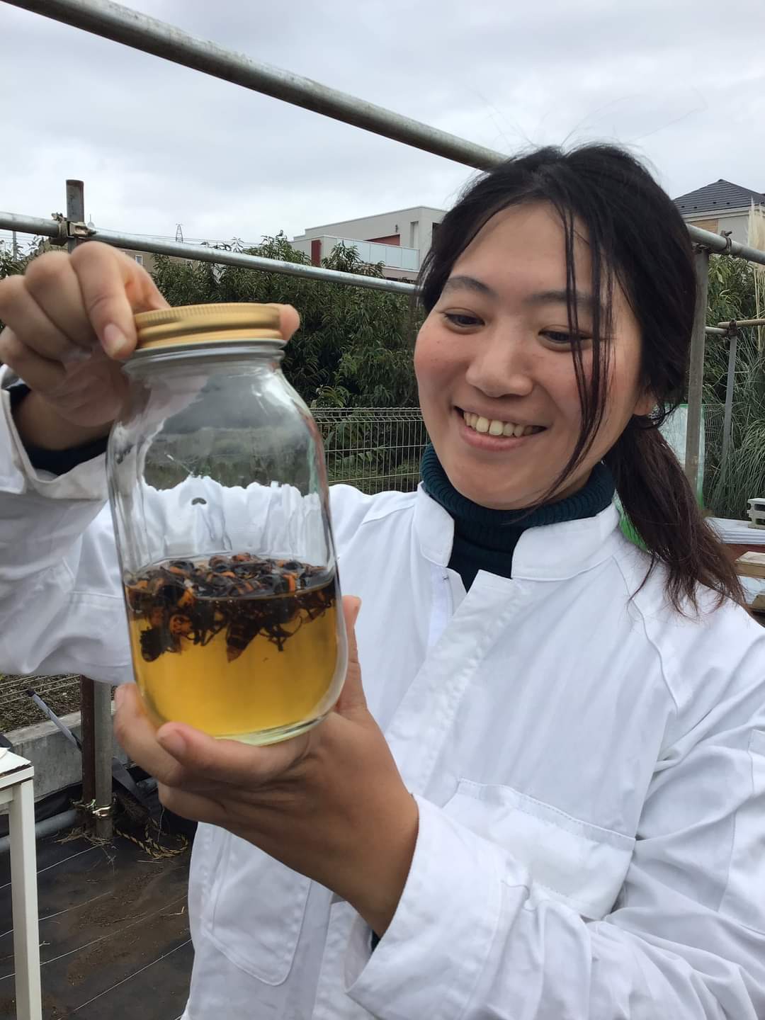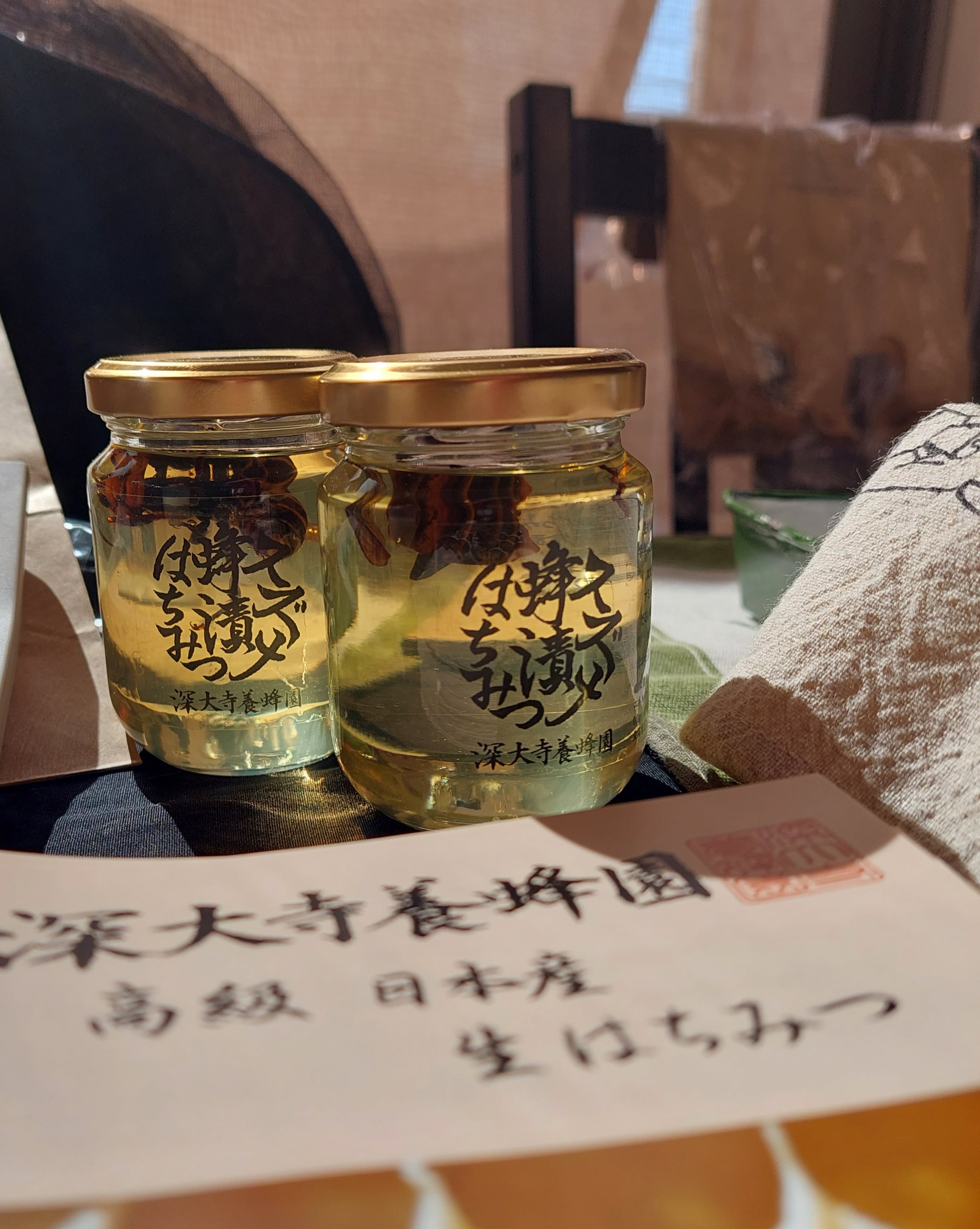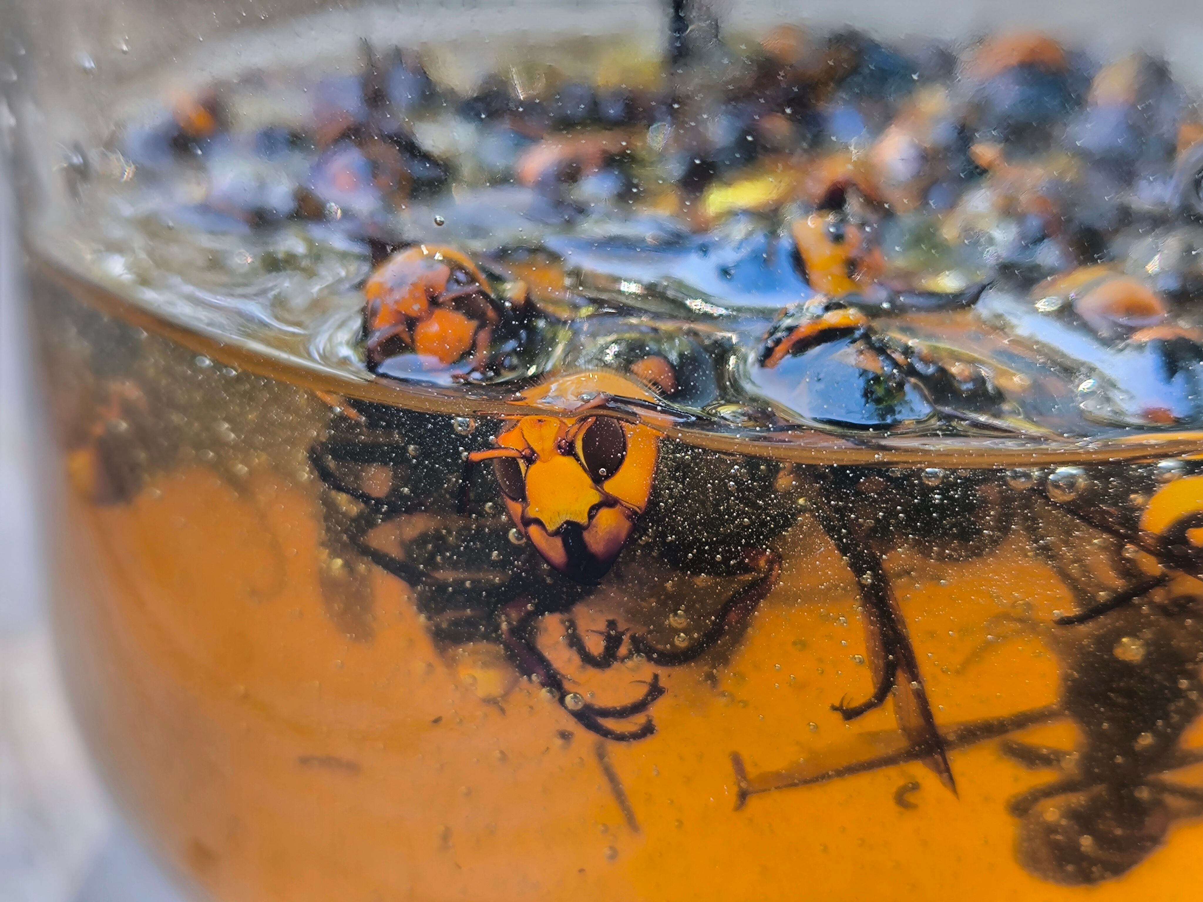 スズメバチの体から蜂蜜や焼酎によって引き出されるスズメバチのエキスは滋養強壮によいと、養蜂家は昔から作ってきました。こちらの「スズメ蜂漬はちみつ」は、私が自ら網でスズメ蜂を捕まえて生け捕りしたものを、そのまま漬け込んだものです。近年、スズメバチは都心でも多く見られるようになり悪いニュースばかりが目立ちますが、生態系から見ると、虫を狩ることで作物に付く害虫を減らす「生物農薬」の働きをし、身近な自然生態系のバランスをとる大切な役割を果たしてくれています。そんな有難い昆虫の恵みのはちみつになります。