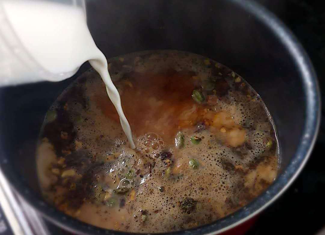 ②沸騰して茶色くなってきたら牛乳を200ml注ぎ入れて再び沸騰。